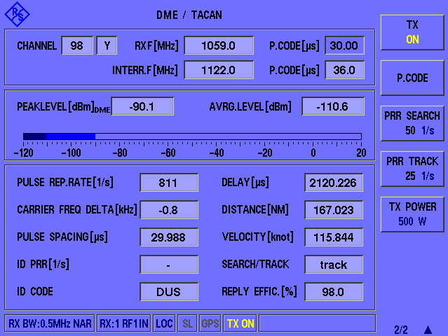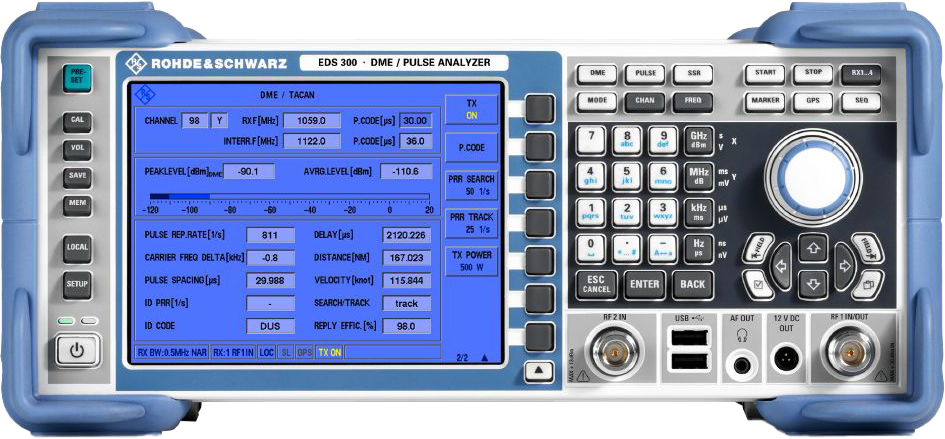 在一個已知與 TACAN 地面站相對方位角的位置上,R&S EDS300 (需配備 R&S EDS-K1 選項) 能夠精確量測並顯示 TACAN 系統的方位角讀數,憑藉其極高的量測精度 (在輸入電平