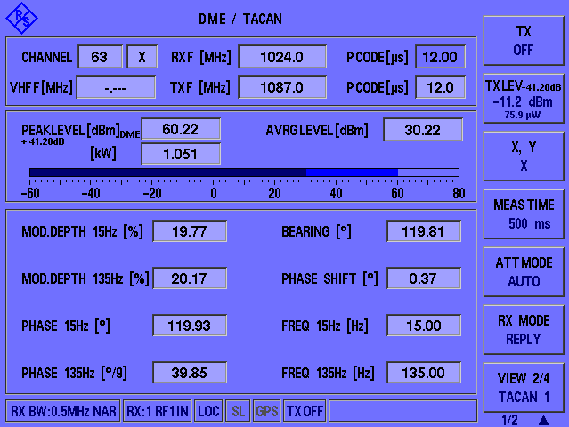 R&S EDS300 能夠對由 TACAN 旋轉天線產生的複雜 AM 訊號進行全面解調與分析,精確量測 15 Hz 和 135 Hz 調變訊號的調變深度、調變頻率,以及它們各自與 MRB/ARB 參考脈衝串之間的相位關係,這些都是評估 TACAN 方位指示品質的核心指標。