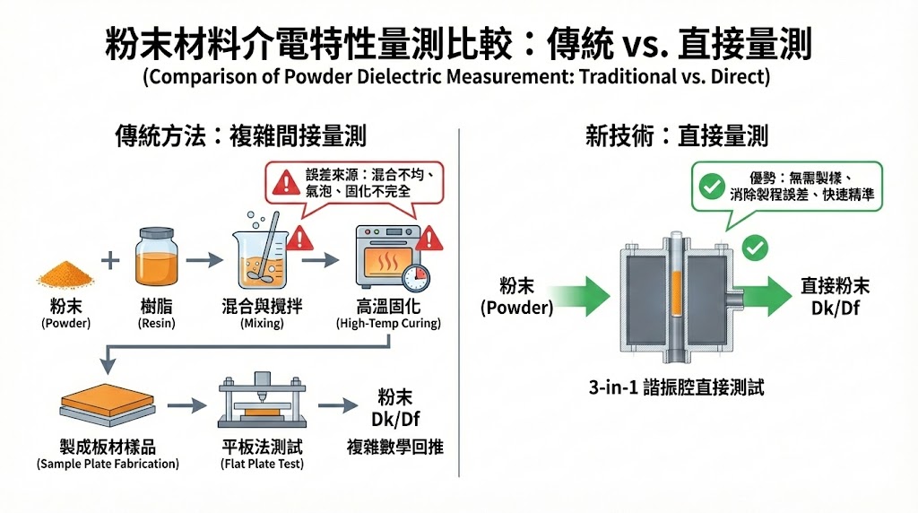 對於開發填料(Filler)、陶瓷粉末或高分子粉末的工程師而言,這項技術最大的價值在於「直接量測 (Measure Directly)」,在傳統方法中,為了測量粉末的介電常數 (Dk) 和損耗因數 (Df),工程師必須將粉末與環氧樹脂混合,經過長時間的高溫固化製成板材,再使用平板法測試,最後還得透過複雜的有效介質理論去回推粉末本身的特性,這中間的混合不均、氣泡產生或固化不完全,都會引入巨大誤差。