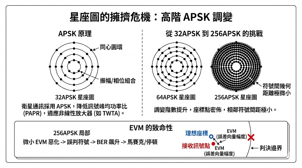 當調變階數提升到 64APSK 甚至 256APSK 時,星座圖上會密密麻麻地佈滿了上百個座標點,這意味著相鄰兩個符號(Symbol)之間的幾何距離變得極其微小。 - EVM(誤差向量幅度)的致命性: