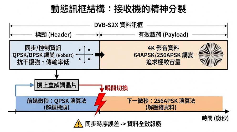 這種設計意味著,機上盒內部的解調晶片必須具備「瞬間切換」的能力,它必須在前幾微秒使用 QPSK 演算法解鎖標頭,緊接著在下一微秒立刻切換到 256APSK 演算法來解壓縮影音資料,如果同步時序有絲毫誤差,整個訊框的資料就會全數報廢。