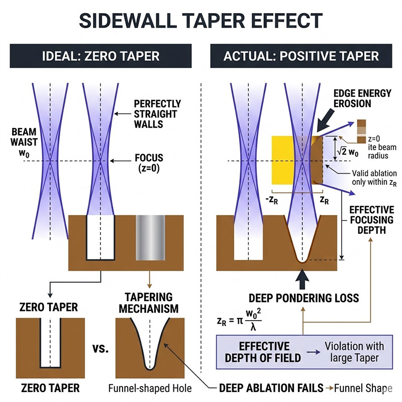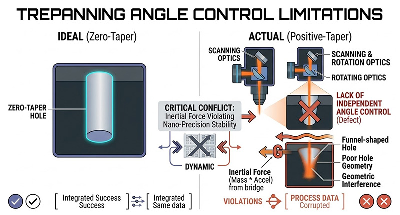 更嚴重的是,雷射光束的邊緣能量會不斷削切孔洞的上半部孔壁,這種現象被稱為「孔壁斜切效應」,隨著加工時間增加,頂部的孔徑越來越大,而底部的孔徑因為能量不足與電漿遮蔽效應而難以擴展,最終的結果,必然是一個漏斗狀的「正錐度」孔洞,這是在純粹的二維掃描與固定光學軸線下,無法違背的物理學宿命,若無法在加工過程中動態改變光束的「入射角」與「焦點深度」,零錐度或倒錐度永遠只是紙上談兵。