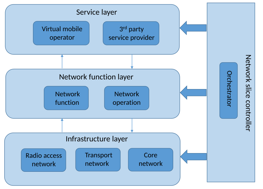 此圖為 5G 網路切片架構,其核心是透過「網路切片控制器」作為大腦,自動化調度底層實體的「基礎設施層」資源,並在「網路功能層」建立虛擬化功能;此舉能為上層「服務層」的多元應用(如大規模物聯網、低延遲通訊等)提供各自專屬的、端到端隔離的邏輯網路通道,透過這種方式,單一的實體網路便能以極高效率,彈性地同時滿足多樣化的市場需求。 (圖片來源:Wikipedia, By Xenofon Foukas, Georgios Patounas, Ahmed Elmokashfi, and Mahesh K. Marina)