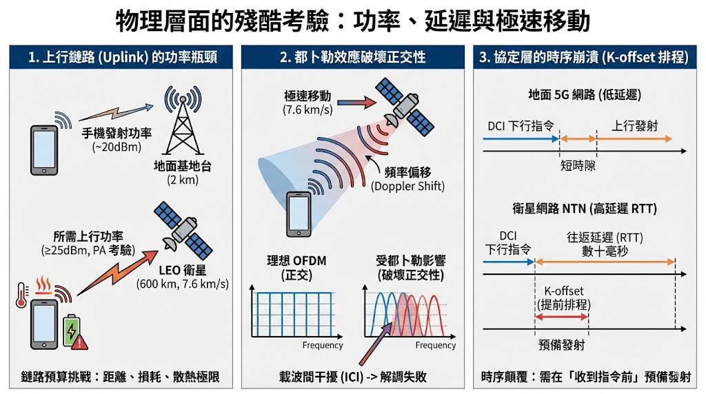當我們要求一部設計用來連接 2 公里外基地台的手機,去連接 600 公里外、以每秒 7.6 公里速度飛行的 LEO 衛星時,物理定律成為最大的阻礙。