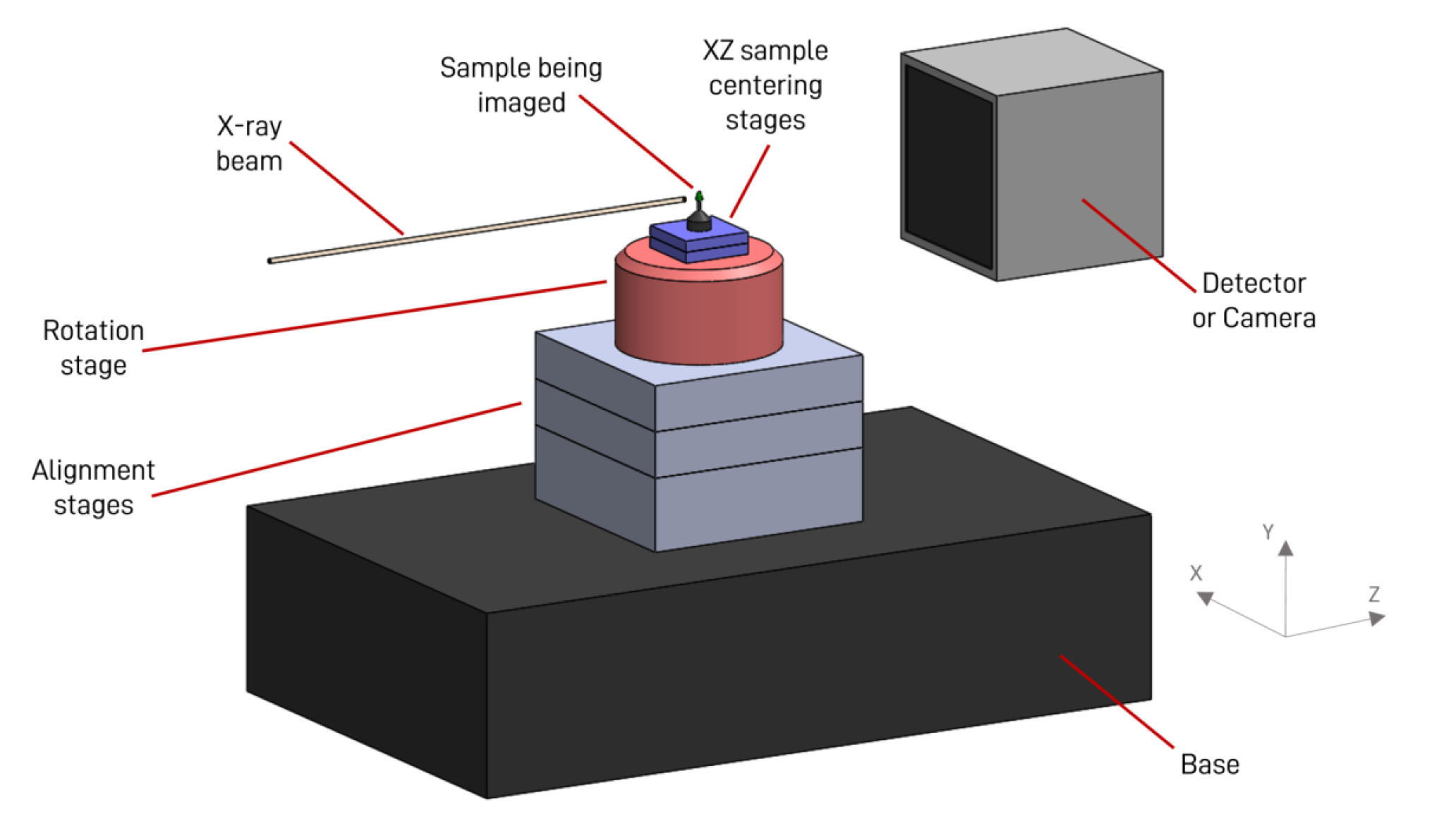 在此配置中,X 光由同步輻射設施產生並從儲存環射出進入光束線,因此光束相對於實驗位置通常是固定的,在實驗期間,偵測器也保持靜止狀態;對準平台的作用是將樣品精確地對準 X 光束與偵測器,根據實驗類型的不同,這些平台可具備三至六個運動軸,在大多數斷層掃描實驗中,對準平台會執行初始對準,隨後在整個成像過程中必須保持靜止不動。