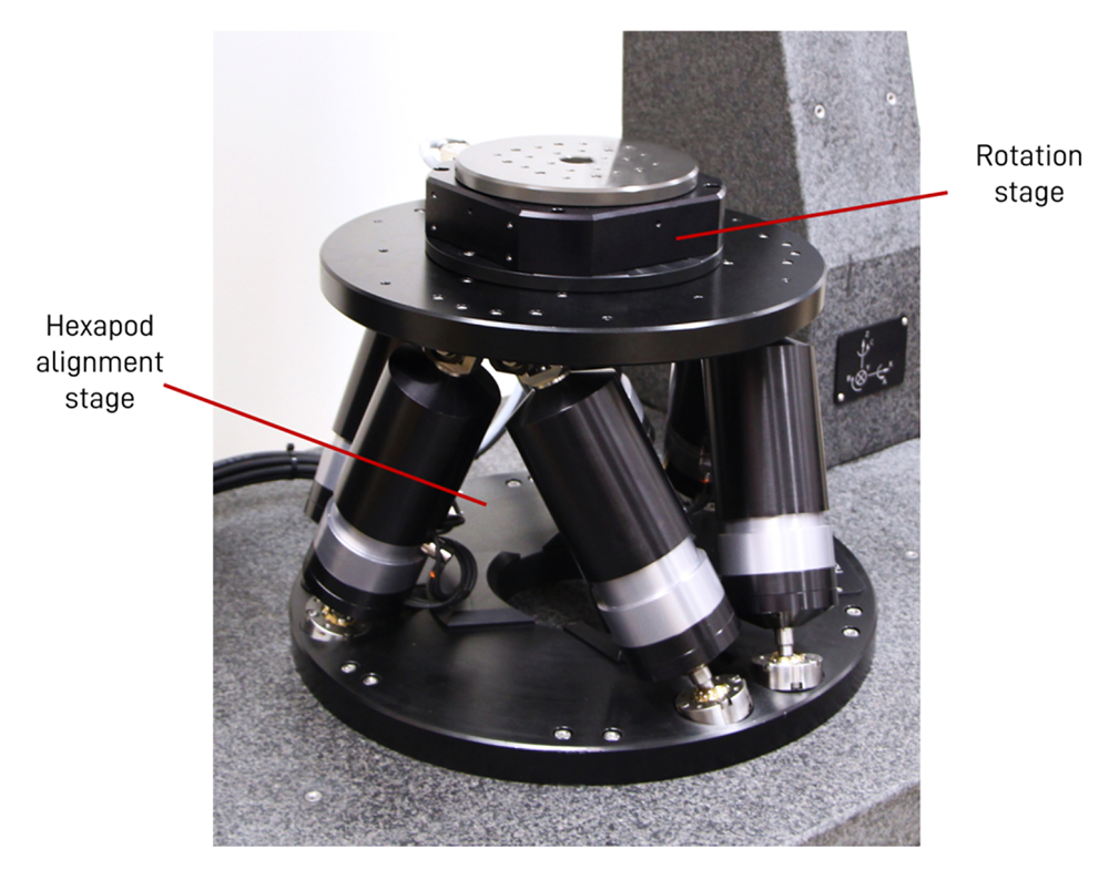 圖 3. Aerotech 的 HEX500 六軸平台與安裝在其移動平台上的精密旋轉平台。