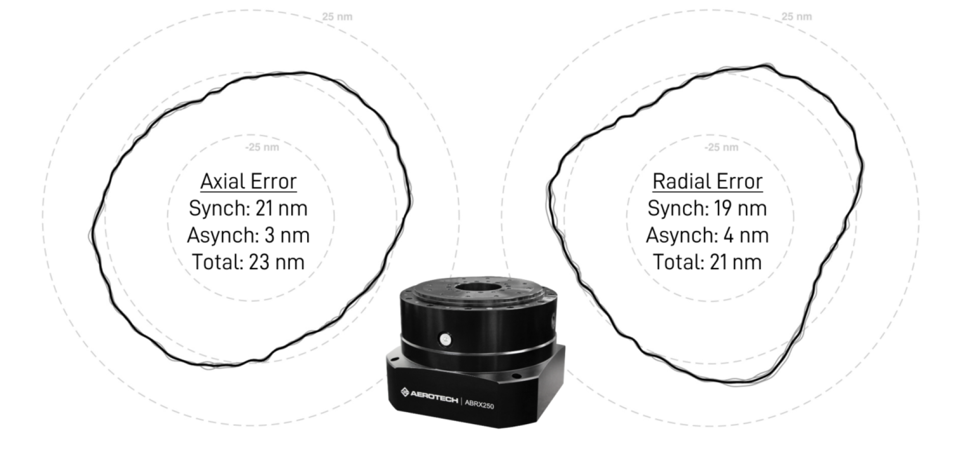 圖 4 呈現了在 Aerotech ABRX250 平台上,以 60 rpm 轉速,在桌面上方 65 毫米(mm)高度處量測到的軸向與徑向誤差運動數據,諸如 ABRX 系列等高品質空氣軸承旋轉平台,能夠實現小於 25 奈米的誤差運動,這使其成為超高解析度斷層掃描實驗的常用選擇。