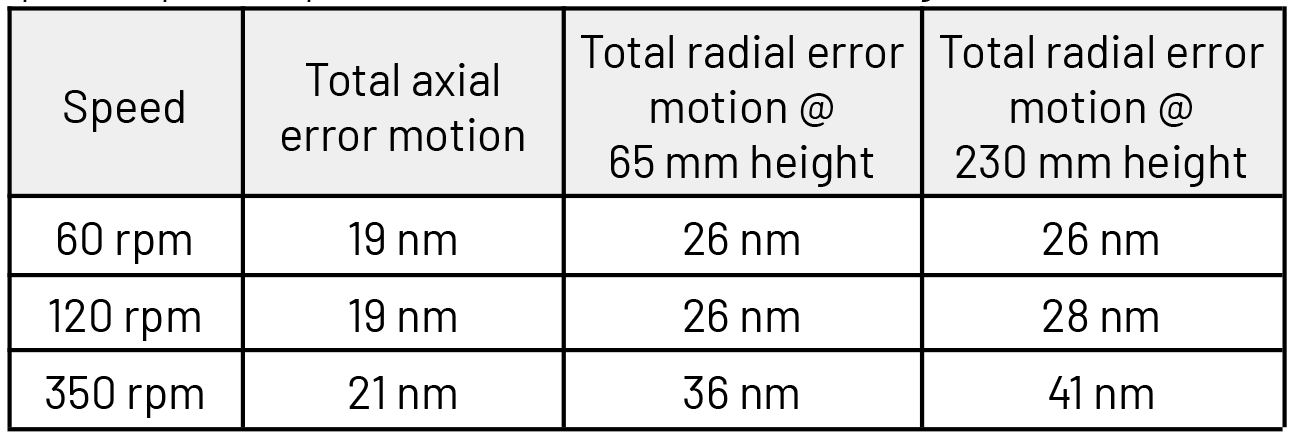 表 1. 配備滑環的 ABRX250 旋轉平台在 60 rpm、120 rpm、350 rpm 轉速以及兩種不同量測高度(65 mm 與 230 mm)下的總軸向與徑向誤差運動結果。