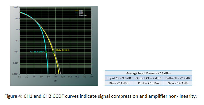 如圖 4 所示,透過增加輸入到放大器的功率,輸出功率的波峰因數量測值隨後下降了近 3 dB,如 CH2 曲線向左移動所示;通道之間不斷增大的差距表示發生了壓縮,指向具有非線性特性的放大器;有趣的是,更常見的確定放大器線性度的方法(評估不同功率水平下的增益變化)僅顯示了 0.2 dB 的增益降低;放大器增益是平均輸出功率與平均輸入功率的比值;這說明了使用 CCDF 圖來充分理解訊號壓縮實際大小的重要性。