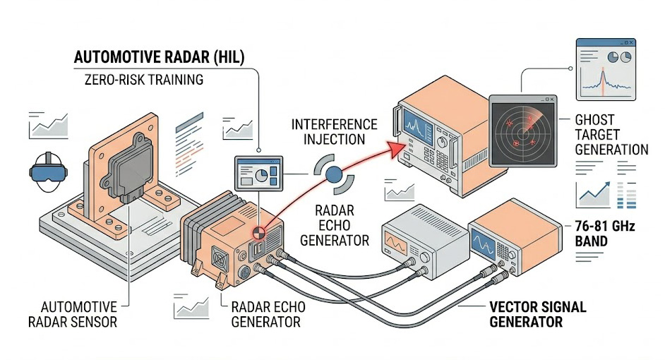 為了解決上述兩種干擾帶來的安全隱患,車廠必須在實驗室內透過硬體迴路(HIL)測試,為雷達感測器注入海量的邊緣情境(Edge Cases),這意味著測試系統不能只單純產生幾個標準的目標回波,它必須「同時」產生具備精確距離、速度與雷達截面積(RCS)的合法動態目標,以及各種不同調變格式、不同功率強度的惡意射頻干擾訊號。