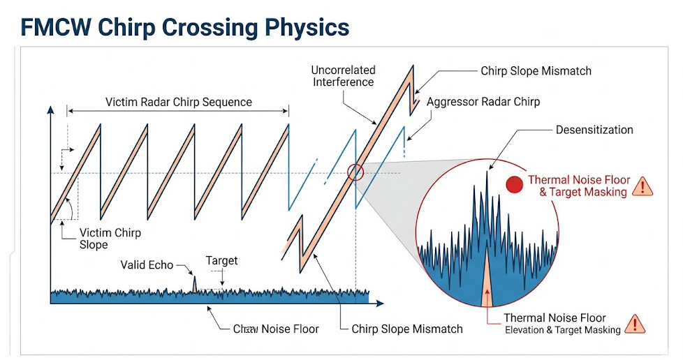 相較於非相關干擾導致的漏偵,另一種更為隱蔽且危險的情況是「相關干擾」,當兩輛配備完全同款雷達感測器(具有相同的啁啾斜率與掃頻參數)的同型車輛相遇,且兩者的發射時序剛好發生微小重疊時,災難便會升級。