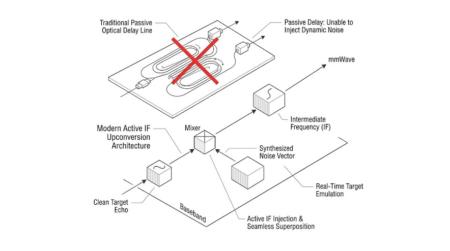傳統的雷達測試往往依賴光纖延遲線(Fiber Optic Delay Lines),這種被動式架構只能將雷達發射的訊號延遲後原封不動地送回,它無法主動修改訊號特徵,更不可能在微波頻段(79  GHz)將外部的雜訊源完美、無相差地疊加到回波訊號上,如果在 79  GHz的空間中直接使用額外的發射天線來注入干擾,極易因為天線場型的空間耦合不良,導致到達雷達接收天線的干擾功率無法精確量化,失去計量學上的準確度。