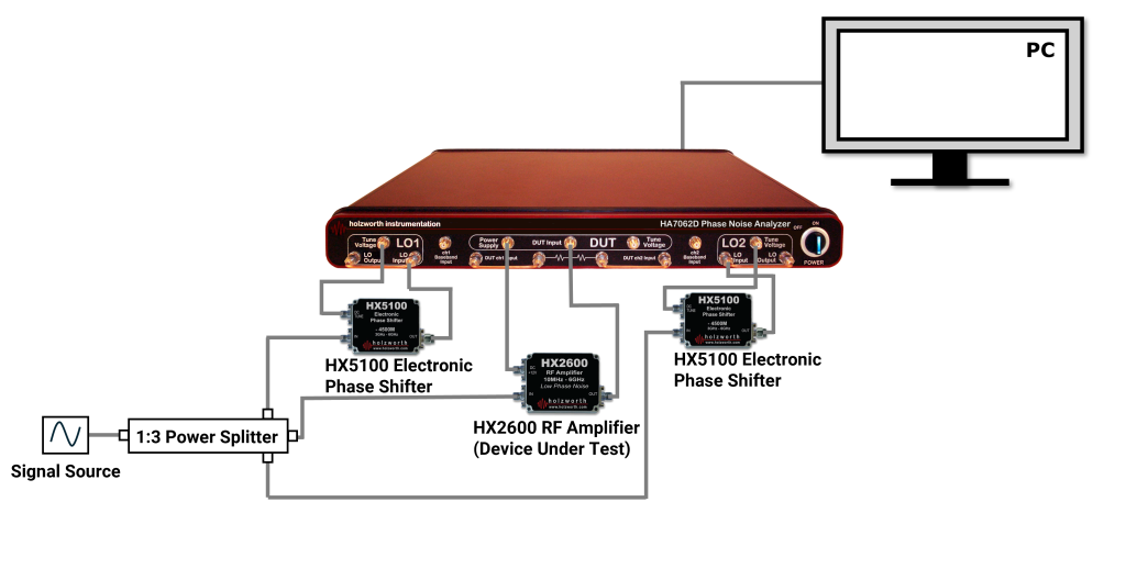 兩個參考路徑則採用 HX5100 系列電子移相器,這些移相器具備特定頻率功能,可與 Holzworth 測試系統無縫整合,實現附加/殘餘相位雜訊量測的完全自動化;同時,這些移相器在量測過程中維持 ANSI z540 校準標準,確保量測結果的可靠性與可追溯性。