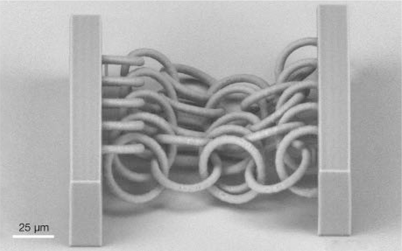 標準的 3D 列印技術難以生產如鏈甲等功能性交錯結構,因為這些結構在生產過程中必須有實體支撐,相比之下,多光子聚合技術可以在凝膠或液態單體中列印懸浮結構,從而實現無支撐的 3D 列印。