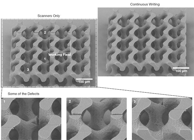 IFOV 與 PSO 不僅僅是工程概念,兩者皆已在由 Femtika 開發的雷射 3D 微處理工具中,展現了其實用能力,Femtika 是立陶宛維爾紐斯大學雷射研究中心的一家衍生公司,該公司的工具適用於 2PP、雷射燒蝕和選擇性雷射蝕刻製程,其雷射工作站的核心始終包含一個飛秒雷射,並結合一個具有奈米級精度的定位系統,為了達到此精度,Femtika 採用了由 Aerotech 開發的線性平台和雷射掃描頭,以及 IFOV 和 PSO 控制器技術;據 Femtika 的技術長 Vytautas Purlys 表示,當初在開發這些系統時,Femtika 曾假設奈米級的精度只能透過壓電平台 (piezo stages) 和固定光學元件來實現,當時最常見的解決方案是將壓電平台安裝在一個更大、精度較低的機械平台上。 Femtika 發現這種方法對於處理小型結構已足夠,但在生產較大結構時,卻會出現拼接問題和極其漫長的製造時間,相對地,透過使用以 IFOV 和 PSO 控制器技術為基礎的高精度線性平台和振鏡,Femtika 不僅在處理較大微結構時品質有所提升,更在製造速度上初步實現了 10 倍的增長,Femtika 發現,透過整合 Aerotech 的雷射掃描頭,處理速度還可以再提高 10 倍。 Vytautas Purlys 表示,Femtika 過去採用壓電平台的 2PP 系統一夜之間只能生產幾十個零件,而使用 IFOV 和 PSO 功能以及先進的運動控制硬體後,使其能夠在相同的時間內生產數千個高品質的結構,將列印時間縮短 20 倍,使 2PP 製程能夠在更短的時間內,以更高的品質生產出顯著更大的零件,此外,它還使微米級的積層製造製程超越了原型製作的範疇,變得更加實用。