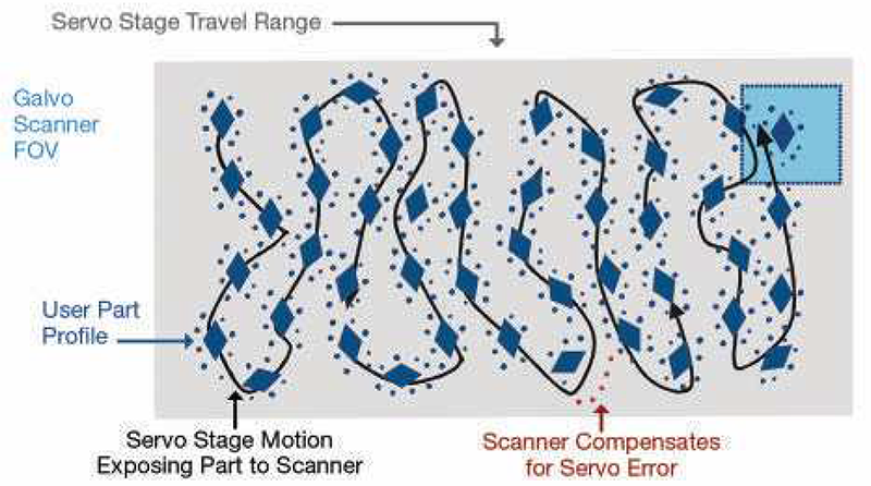 此圖呈現了無限視野 (IFOV) 如何利用線性的 XY 伺服軸來擴展雷射掃描頭(右側藍色方塊)的視野 (FOV),隨著掃描器 FOV 沿著伺服平台的運動路徑移動,它可以即時處理該 FOV 內的任何特徵。