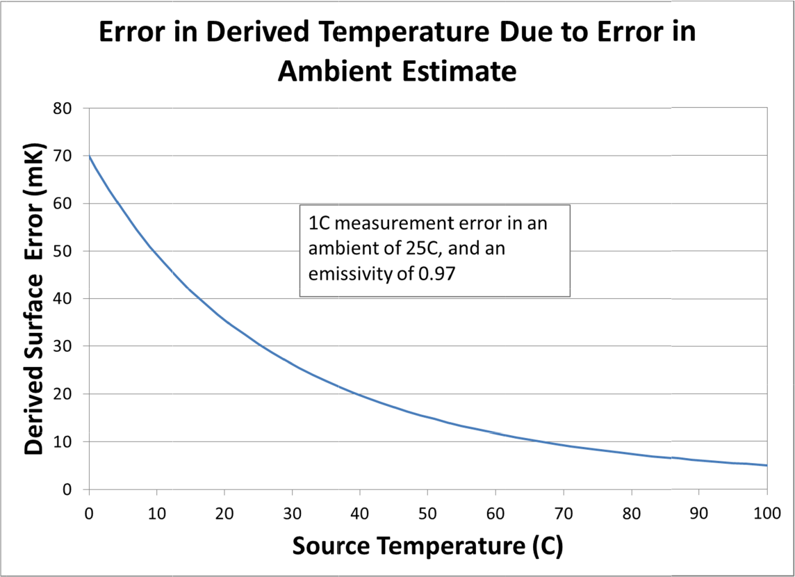 對於許多高靈敏度的紅外線系統而言,30mK可能已經是一個不可忽略的誤差值,在大多數常規應用中,這樣的誤差或許尚在可接受範圍內,但在低溫量測區間(此時黑體自身輻射較弱,環境反射的相對佔比較高)或者當需要量測與環境溫度差異極小的目標時(例如在MRT測試中),此誤差相對於期望的環境校正值而言就可能變得非常顯著;一個有效的改進方法是提高黑體表面的發射率,例如,若能將表面發射率提升至0.995,則上述因環境溫度估算誤差所引起的視在溫度誤差效應將會大幅降低約6倍,這將使得輻射量測結果對於環境條件及其變化的不完美認知具有更強的耐受性 (tolerable) 和穩定性。