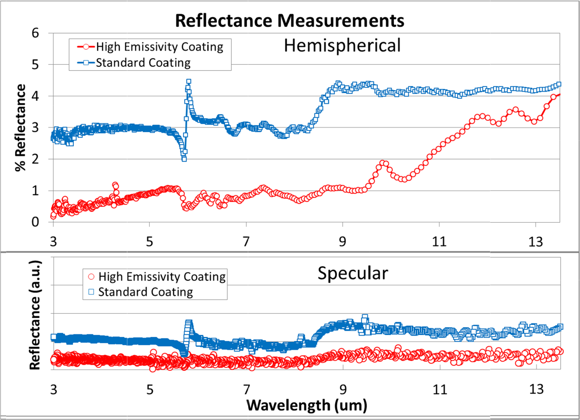 為了精確表徵塗層的光學特性,研究人員對兩種不同批次的高發射率塗層樣品以及作為對照組的SBIR標準塗層樣品,進行了詳細的光譜反射率量測,其中,半球反射率 (Hemispherical reflectance) 的量測是使用 Nicolet 傅立葉轉換紅外光譜儀 (Fourier Transform Infrared Spectrometer, FTIR) 的Surface Optics Corporation SOC-100型半球反射儀完成的;此儀器能夠收集從樣品表面向整個半球空間反射的總輻射能量,從而得到在特定波長下材料的總反射特性,與此同時,鏡面反射率 (specular reflectance)(即沿鏡面反射角方向的反射)的量測則是在一台Bruker 113 FTIR光譜儀上進行的。