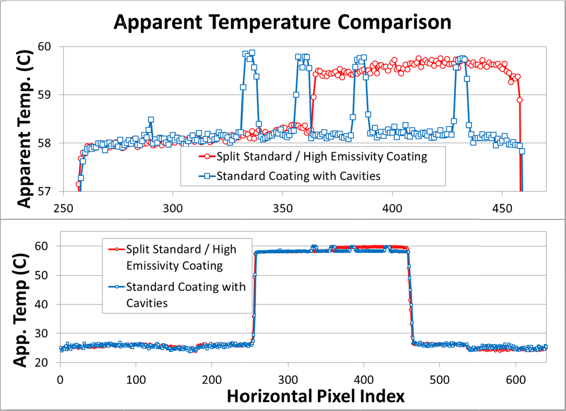 圖4:用於塗層性能測試的黑體表面溫度分佈曲線。曲線的具體擷取位置已在圖3中由綠色線條標示。值得注意的是,高發射率塗層區域所呈現的視在溫度(或輻射強度)非常接近於那些作為理想參考的、開設在全標準塗層黑體中的微型腔體區域。