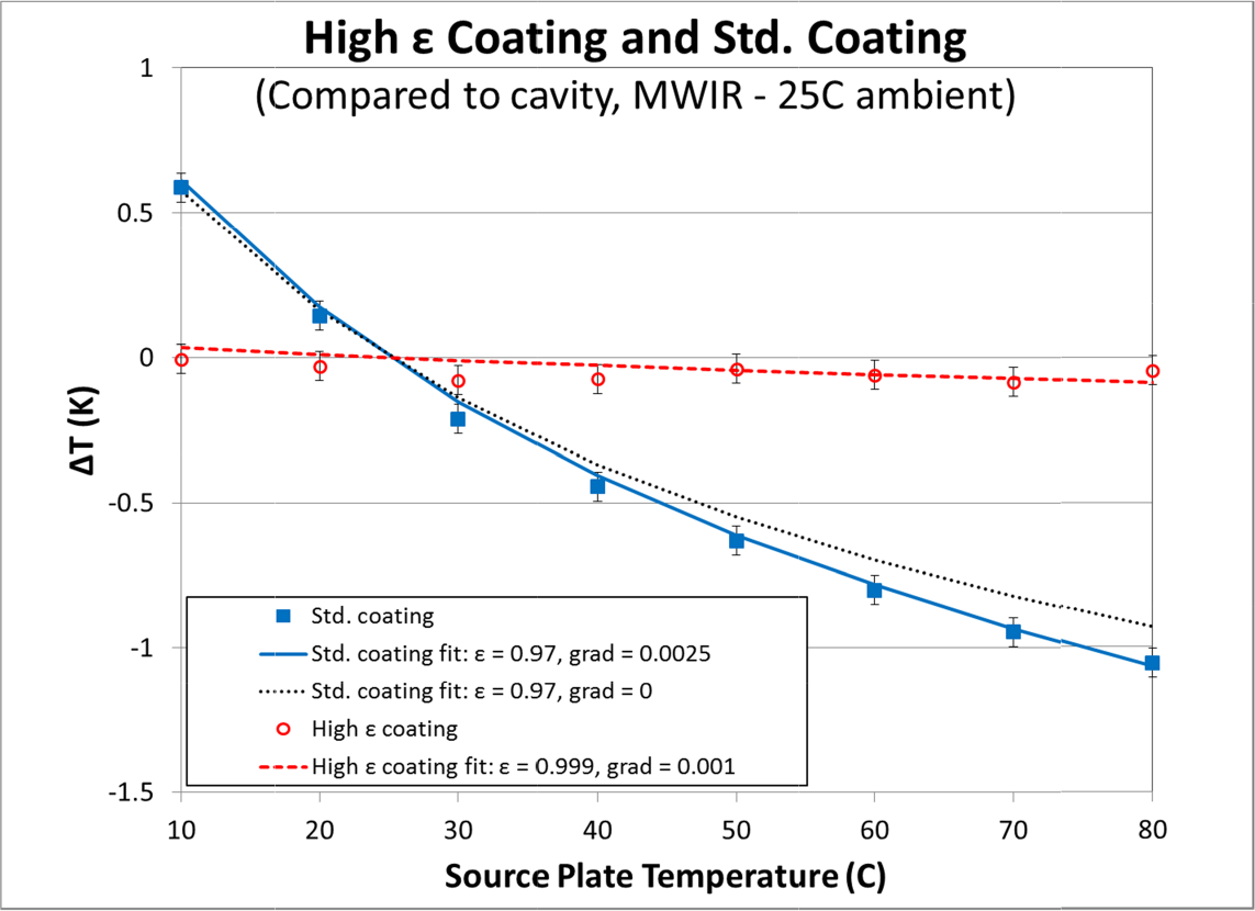 圖5:MWIR波段下,標準塗層和高發射率塗層相對於標準塗層源板上微型腔體中心的視在溫差數據,以及對這些實驗數據點的理論擬合曲線。點狀虛線是基於標準塗層實測發射率0.97的理論預測曲線(未考慮溫度梯度)。