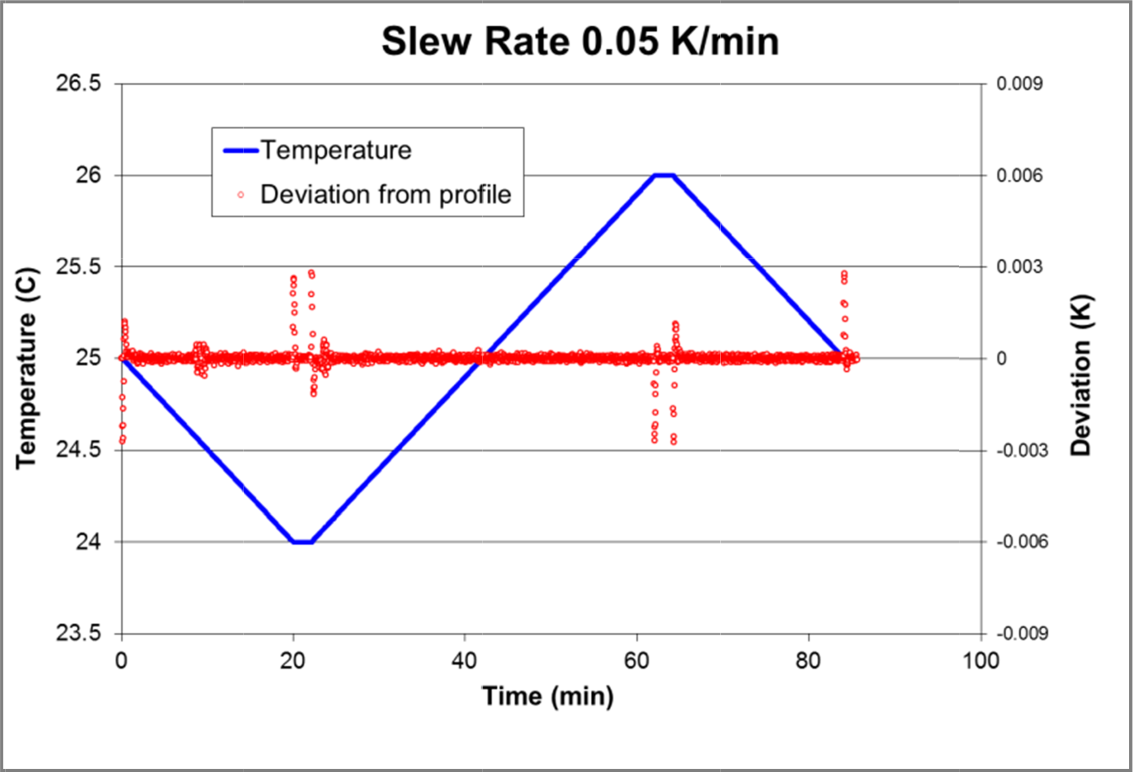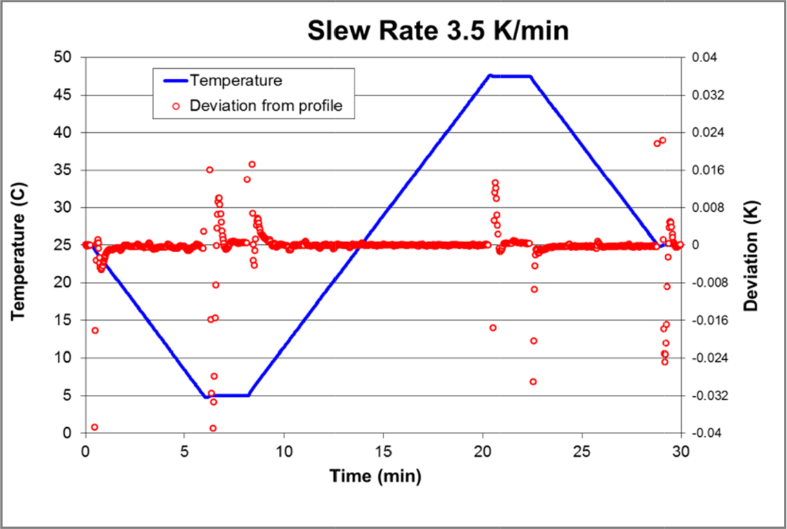 為了驗證此新型等速升降溫演算法的實際性能,研究團隊使用了一台 SBIR 的4英寸 Infinity 系列大面積黑體進行了系列測試,測試過程中,系統被指令執行一系列的溫度變化程序:首先從一個接近環境溫度(例如25°C)的初始狀態開始,以設定的速率向下調節至一個與環境溫度有合理溫差的較低溫度,然後再以相同速率向上調節至一個與環境溫度有相似溫差的較高溫度,最後再以設定速率返回至初始的25°C。整個演算法在一系列不同的升降溫速率下進行了測試,範圍從極慢的 0.05K/min (Kelvin每分鐘) 到較快的 10K/min。對於那些速率較快的降溫過程,設定了保護機制,使其在溫度低於環境溫度的差值超過預設最大允許溫差之前自動停止,以保護致冷系統。