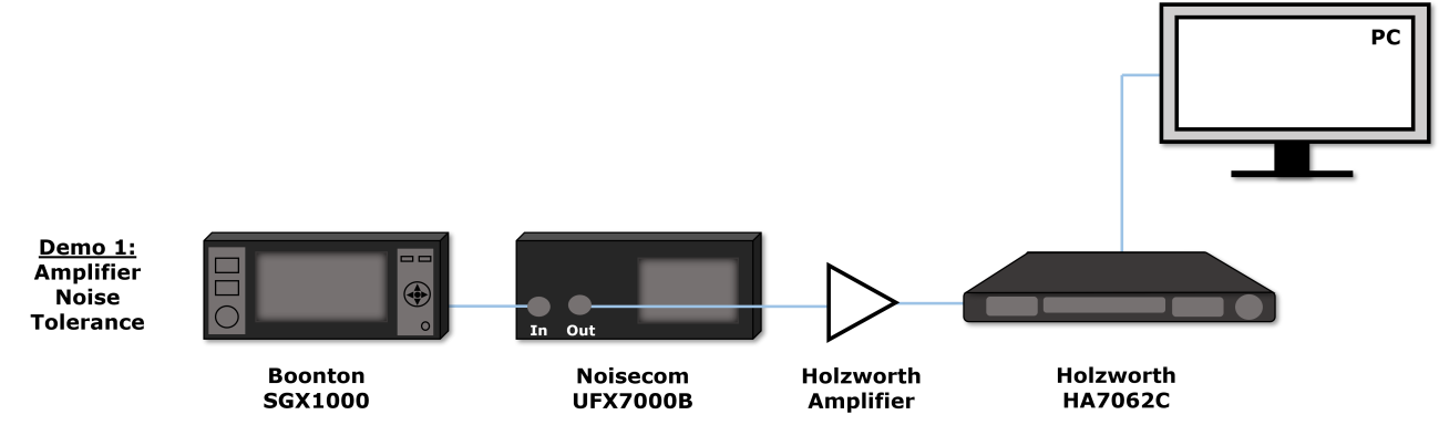 此圖展示了放大器雜訊容限測試的典型配置,其中 Boonton SGX1000 系列射頻訊號產生器提供一純淨的參考衛星訊號,該訊號與 Noisecom UFX7000B 可程式化雜訊產生器輸出的受控干擾訊號(模擬真實世界的雜訊)進行合路,接著此混合訊號被饋入作為待測物的 Holzworth HX 系列放大器,最後,Holzworth HA7062C 即時相位雜訊分析儀用於擷取並分析放大器在不同雜訊條件下的輸出訊號特性與完整性。