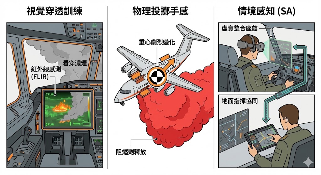 傳統的飛行訓練可以模擬機械故障或惡劣天氣,但「野火」是一個具有生物特性的動態敵人,它會隨風向改變蔓延路徑,會因植被乾燥程度改變燃燒速度,產生的濃煙會瞬間遮蔽視線;實機訓練成本極高且風險巨大,且無法模擬向火源投擲昂貴化學阻燃劑(Retardant)的物理過程。新一代的模擬技術將可解決三大痛點: