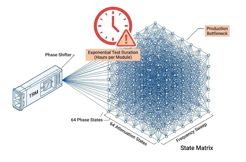在傳統的序列式測試架構中,儀器發送控制指令、等待 TRM 狀態穩定、射頻合成器鎖相、網路分析儀擷取數據,這一連串動作通常需要幾十到幾百毫秒,將這微小的時間乘以數百萬次的狀態切換,單一 TRM 的完整特性分析往往需要耗費數小時,面對一個包含兩千個 TRM 的 AESA 雷達陣面,若不具備革命性的平行處理與微秒級狀態切換能力,生產線將徹底被這「維度詛咒」所拖垮,產品的上市與交付週期將從幾個月被無限期延長至數年。