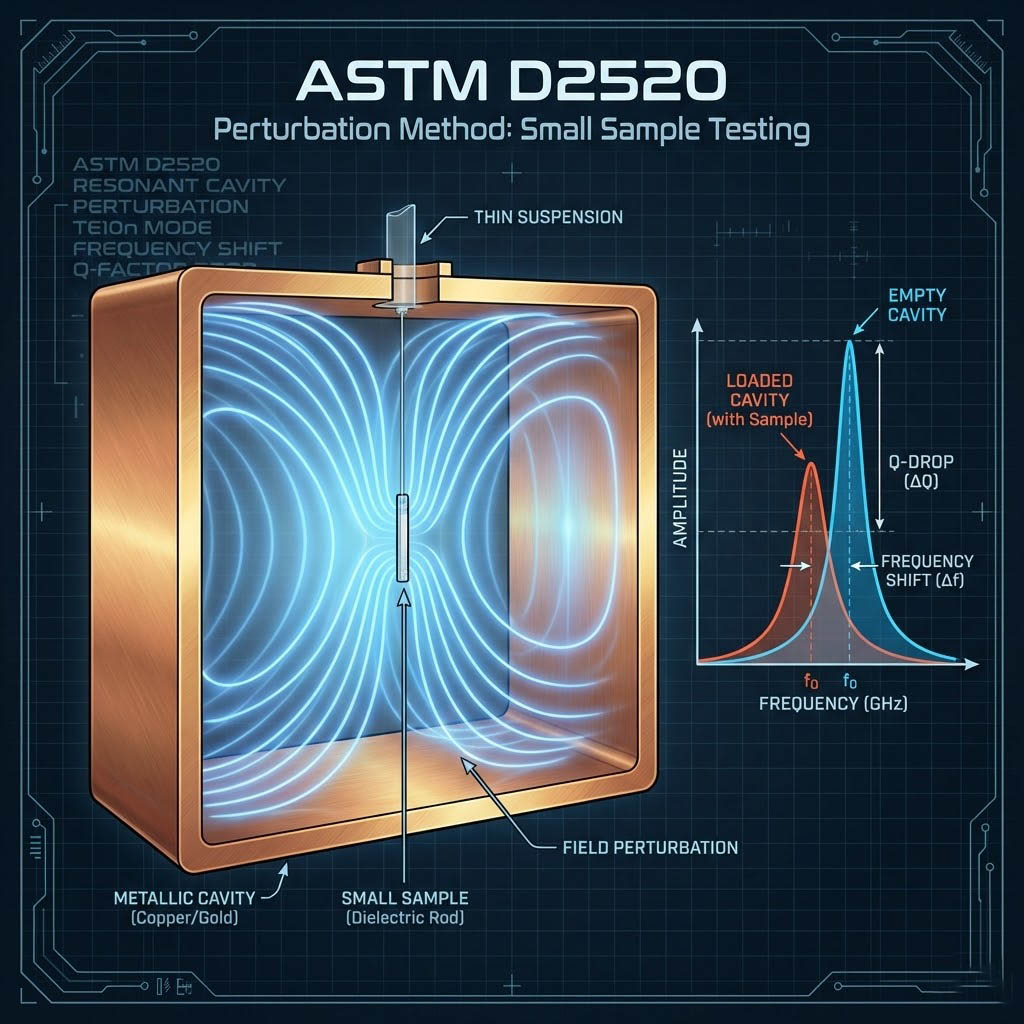 此時,ASTM D2520 標準中的 微擾法 (Perturbation Method) 便成為了解決此類「小樣品」測試需求的關鍵技術,不同於要求樣品填滿電磁場的傳統方法,微擾法利用了「微小體積樣品」對共振腔電磁場產生的干擾原理,能夠在樣品體積極小的情況下,精準萃取出材料的介電常數 (Dk) 與損耗因數 (Df)。