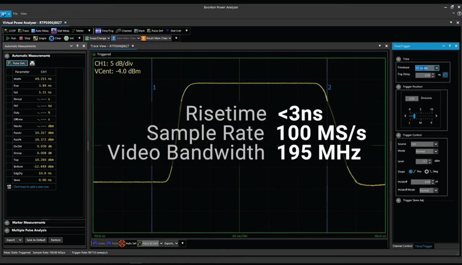 此圖為 Boonton Power Analyzer 軟體介面,展示了 RTP5000 系列感測器優異的脈衝擷取能力,該系統具備小於 3 ns 的上升時間與 100 MS/s 取樣率等高效能規格,可精準分析波形,並於左側面板即時顯示多達 16 項自動化脈衝參數,大幅簡化測試流程。