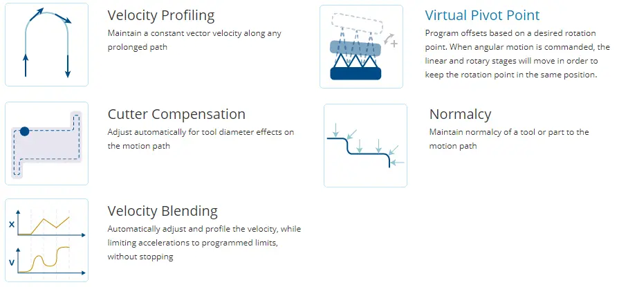Automation1 平台內建一系列強大的標準功能,重點在提供無與倫比的運動精度、流暢度與加工效率。這些功能從根本上簡化了複雜運動輪廓的程式設計與執行。