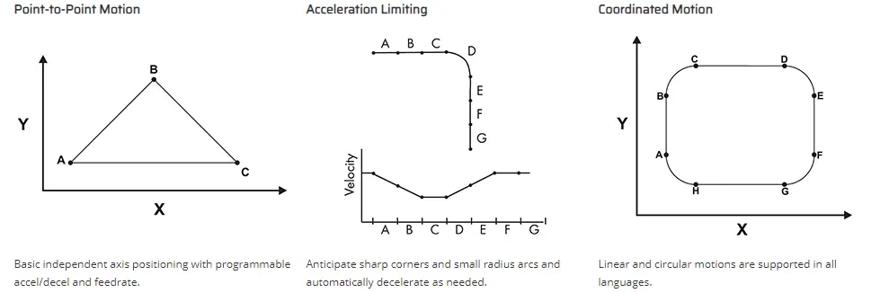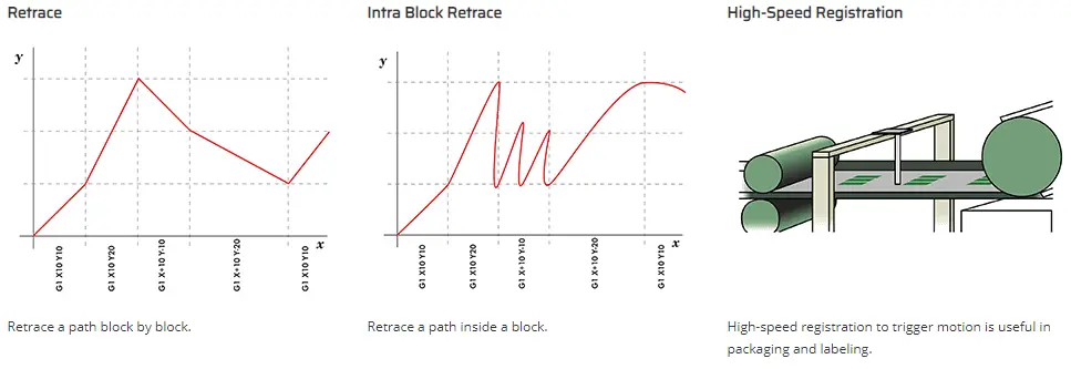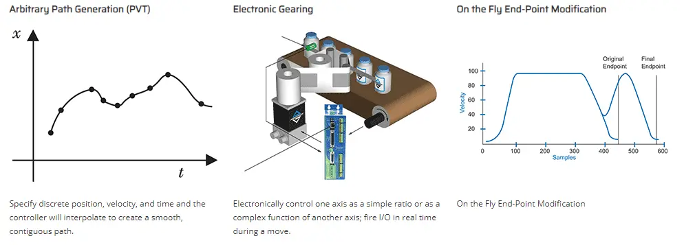 左至右為:任意路徑產生 (PVT)、電子齒輪、運動中終點修改。這些功能實現了高度自訂化與即時反應能力。