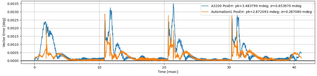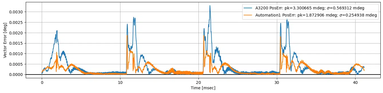 圖二顯示了在不使用 FIR 濾波的情況下,Automation1 平台(橘色線)與 A3200 平台(藍色線)的向量軸位置誤差隨時間變化的比較,可以看出 Automation1 的誤差幅度明顯較小。