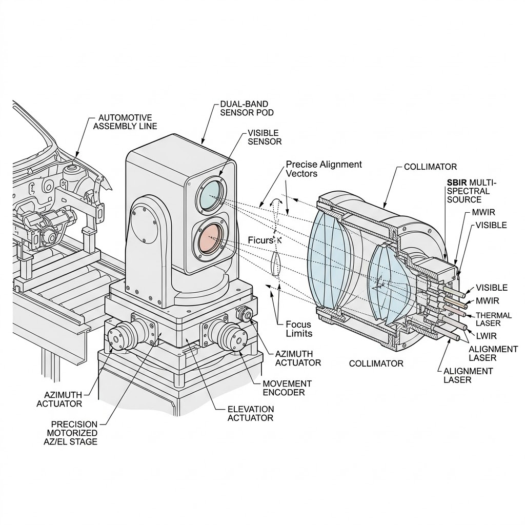 此自動化汽車測試站示意圖,展示精密電動方位/俯仰平台載運雙波段感測器艙(含可見光與熱像儀核心),對準「SBIR多光譜光源準直儀」,準直儀提供MWIR、VIS、對準雷射複合光束,圖中以桃色指示對準向量。