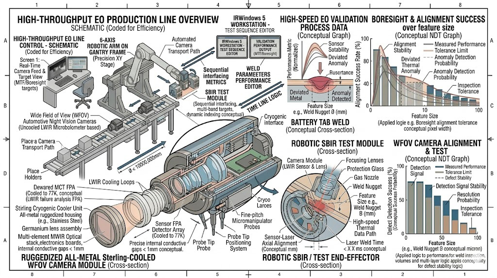 然而,當這些高階的雙波段廣角載荷完成實驗室的雛形開發,準備進入超級工廠進行大規模量產時,設備整合商將面臨截然不同的物理與工程挑戰。在研發階段,工程師可以耗費數小時在光學桌上微調單一鏡頭;但在產線的驗收測試 (ATP) 階段,每一台機組的測試週期 (Takt time) 被嚴格壓縮至幾分鐘甚至幾十秒內。反面論述指出,採用簡易的熱源與人工肉眼判讀圖卡,在初期建置成本與產線佈署速度上具備優勢;但在本文討論的「車規級高保真度」與「百萬規模高通量量產」範疇內,手動對位與非標準化的光源,將導致嚴重的漏判與出廠品質不一。為了在極短的測試週期內確保每一套系統的光電精度,產線自動化測試實務上必須克服以下三大工程壁壘。