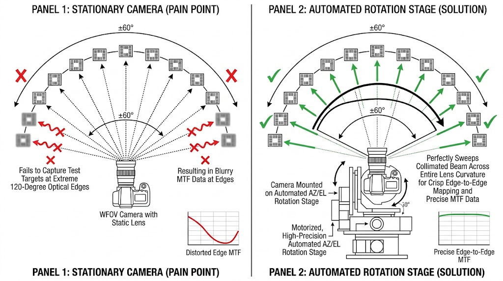 此示意圖對比固定相機與高精度自動方位/仰角旋轉台,固定相機於 120 度極限光學邊緣測量,致準直光束掃描不良,MTF 數據模糊失真;自動旋轉台則實現完美掃描,獲取清晰全視場 MTF 數據。