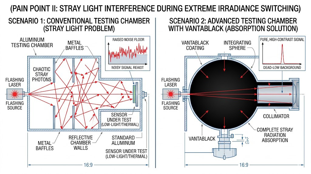 測試腔室雜散光解決方案對比示意圖:傳統腔室因金屬隔板反射抬高底噪;先進腔室利用 Vantablack 積分球準直儀完全吸收雜散輻射,獲取純淨高對比訊號。