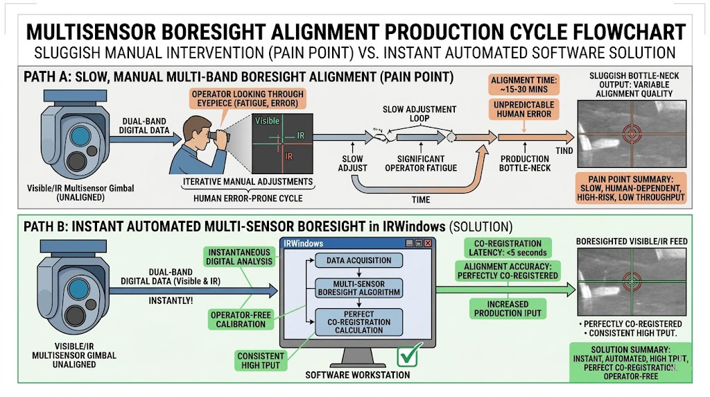 多感測器光軸對位流程對比示意圖:人為手動調整(痛點)導致誤差大、產量低;IRWindows 自動化軟體(解決方案)可即時實現完美共同註冊,提高生產效率與產量。