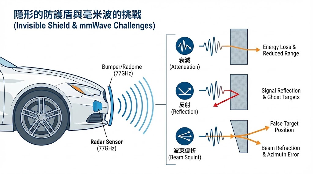 在現代車輛設計中,為了追求流線型的空氣動力學外觀與美學設計,毫米波雷達感測器(Radar Sensor)通常被「隱藏」在保險桿(Bumper)或品牌標誌(Radome/Emblem)的後方,對於駕駛者而言,這些覆蓋物是美觀的裝飾;但對於雷達工程師而言,它們卻是可能阻擋、反射甚至扭曲訊號的「障礙物」。