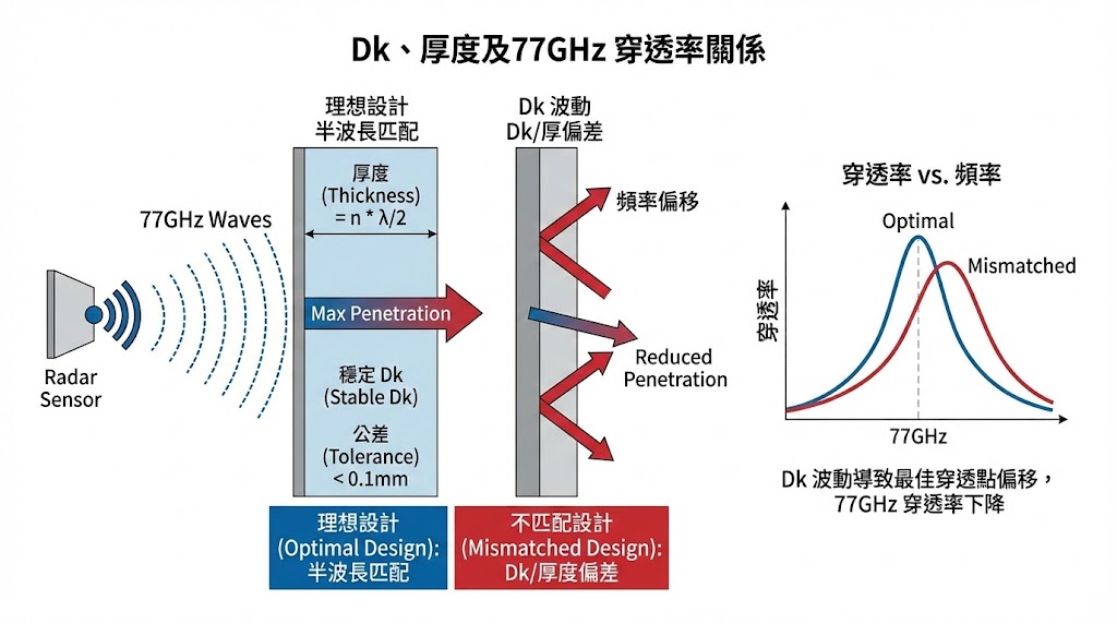 保險桿通常由聚丙烯 (PP)、ABS 或聚碳酸酯 (PC) 等複合材料製成,為了讓電磁波最大程度地穿透,雷達罩的設計必須符合「半波長」原理,理想的雷達罩厚度應設計為材料內半波長的整數倍,由於 77GHz 的波長極短,這意味著保險桿的厚度公差必須控制在極小的範圍內(例如 0.1mm 以內),且材料的 Dk 值必須高度穩定,如果 Dk 值發生波動,最佳穿透頻率就會發生偏移,導致在 77GHz 工作點的穿透率大幅下降。