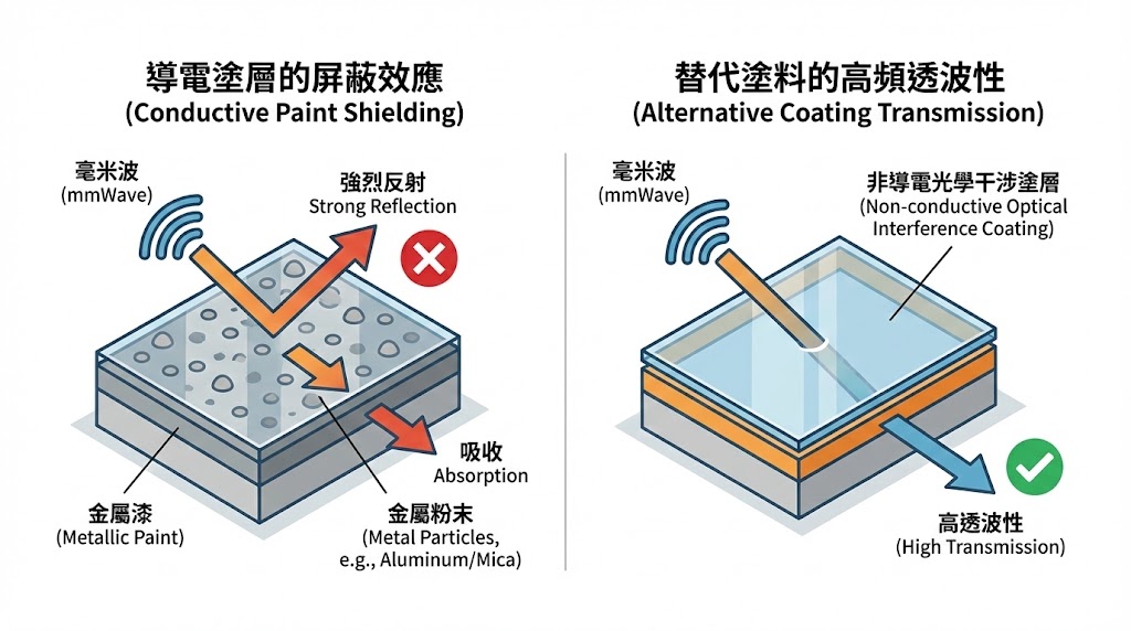 為了美觀,車廠常使用含有金屬粉末(如鋁粉、雲母)的金屬漆,在毫米波頻段,這些微小的導電顆粒會形成連續的導電層,對電磁波產生強烈的反射與吸收作用;因此開發具有「金屬光澤」但不含導電粒子的替代塗料(如銦錫氧化物 ITO 或特殊光學干涉塗層),並驗證其高頻透波性,是材料研發的重點。