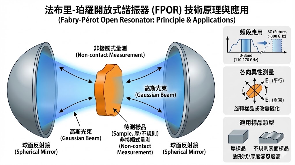 針對 D-Band (110-170 GHz) 甚至未來的 6G 頻段,或者需要測量材料各向異性 (Anisotropy) 的應用,FPOR 技術提供了另一種解決方案,它利用兩個反射鏡形成開放式共振腔,透過高斯光束 (Gaussian Beam) 進行非接觸式量測,特別適合厚度較大或不規則的樣品。