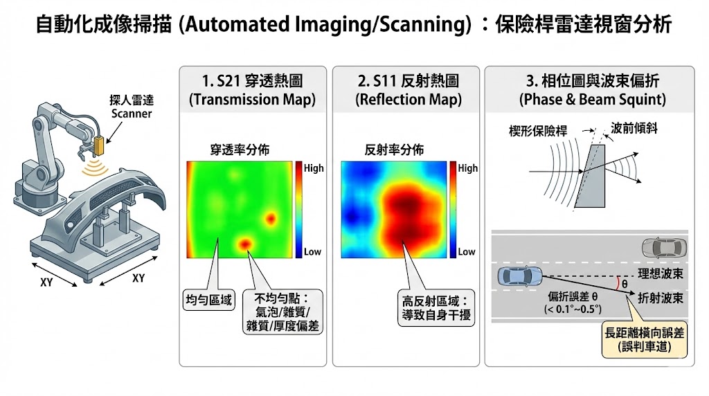 這是最關鍵的指標,當電磁波穿過厚度漸變(楔形)的介質時,波前 (Wavefront) 會發生傾斜,透過分析掃描數據中的相位變化,可以計算出波束經過保險桿後的折射角度;一般車廠要求波束偏折誤差需小於 0.1° 至 0.5°,否則雷達在長距離偵測時,橫向位置誤差會達到數公尺,導致 ADAS 系統判斷錯誤(例如誤判前車在左車道還是本車道)。