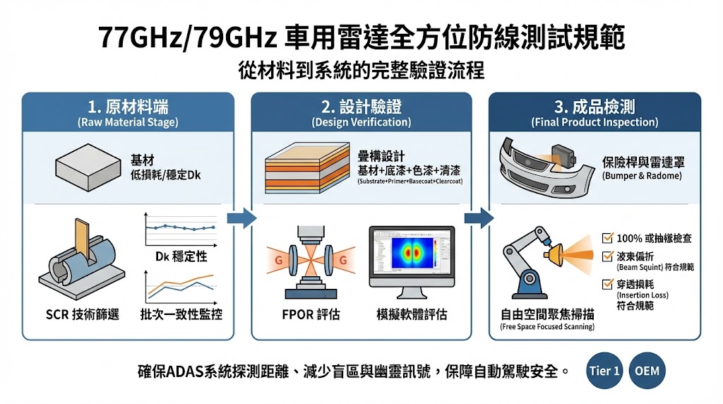 77GHz/79GHz 車用雷達的效能,不僅取決於雷達晶片與演算法,更受制於其「外衣」— 保險桿與雷達罩的電磁特性,忽視材料驗證,將直接導致 ADAS 系統的探測距離縮短、盲區增加甚至產生幽靈訊號,建立一套完整的測試規範至關重要: