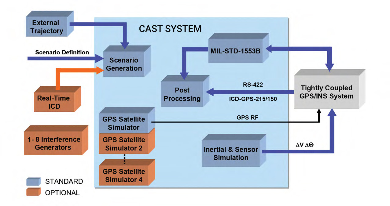 高擬真IMU模擬是GNSS+IMU耦合測試的關鍵環節,場景產生器提供真實運動狀態(User State),經過IMU真值模型(IMU Truth Model)後,再疊加加速度計誤差模型(Accelerometer Error Model)與陀螺儀誤差模型(Gyro Error Model),最終生成帶有真實感測器特性的IMU數據(DeltaV_TB,Deltatheta_TB),用於驅動或驗證融合演算法。