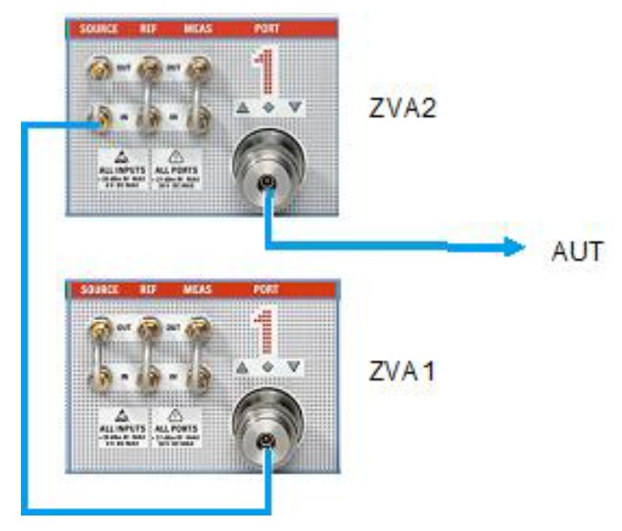 ZVA1 的訊號會經過方向性耦合器(directional coupler),再進入 ZVA2 的 Test Port 1,最後透過纜線連至 AUT,此路徑仍對應於 ZVA1 的 Port 1;接著對 ZVA1 的四個埠執行四埠校準(可使用校準模組或機械校準套件),以建立在 ZVA1 的「定義相干模式」對話框中所設定的振幅與相位關係。
