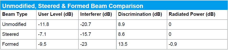 在這種情況下,干擾抑制度提升至 13.5 dB,雖然整體天線輸出功率略有降低,但訊號品質與方向性分辨能力(discrimination capability)明顯改善。