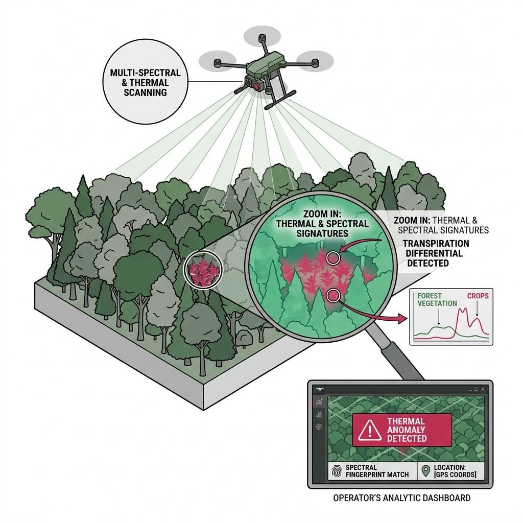 無人機利用多光譜與紅外線感測器在深山林地中篩選與識別異常毒品植物之流程 - 在真實環境中,不同植物品種(如深山原生林木與非法種植的大麻或罌粟)的生長狀態、葉片細胞結構以及對水分的吸收需求都不相同,這會產生兩種可被高階無人機偵測的特徵