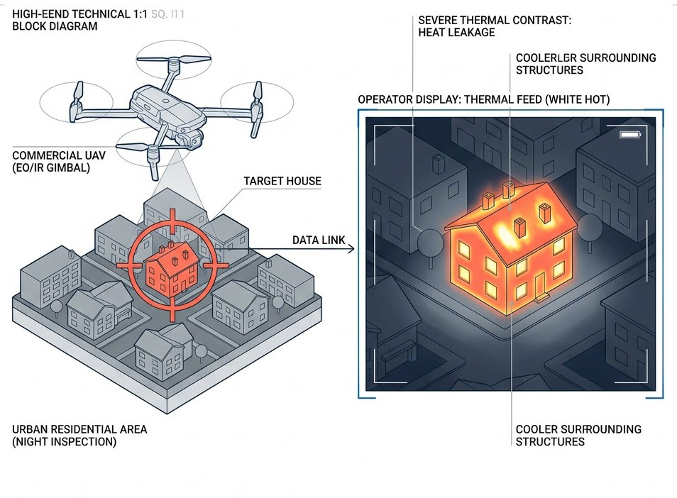 在城市發展與綠能建築領域,無人機的紅外線掃描常被用於評估建築物的能源效率(如檢測大樓外牆的冷氣外洩或隔熱層破損),同時這種技術也可被治安單位用於偵測住宅區內異常的高耗能活動(如室內非法種植常伴隨異常的屋頂高溫排熱),透過匯入高解析度的 3D 城市建築模型,ViXsen 能計算建築物在不同日照角度下的熱積累,無人機操作員在模擬環境中,練習於複雜的城市光暈(City Glow)與密集的背景熱雜訊中,精準圈選出存在異常熱洩漏的單一建築物,為綠能評估公司拓展了高度專業化的商業服務項目。