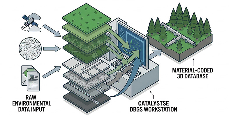 CatalystSE DBGS 工作站將原始地理數據轉化為具備商業管線與特定植被材質編碼的 3D 合成環境流程
